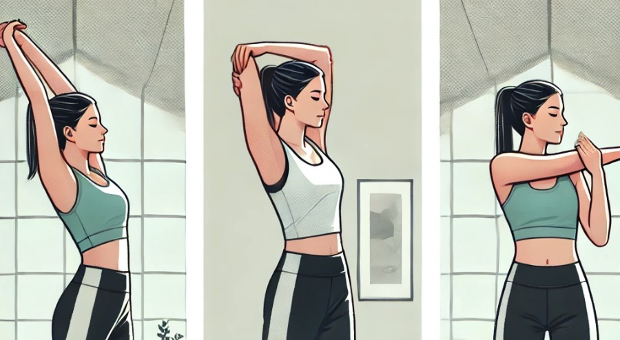 - 삼두근 스트레칭: 한 손으로 팔꿈치를 잡고 머리 뒤로 눌러주는 동작, 30초씩