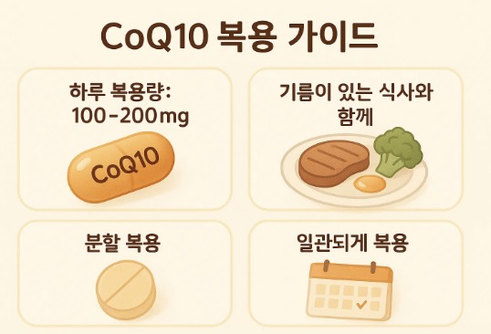 - 체내 흡수율은 개인차가 크므로, 지용성인 CoQ10은 기름이 함유된 식사와 함께 복용하는 것이 좋습니다.