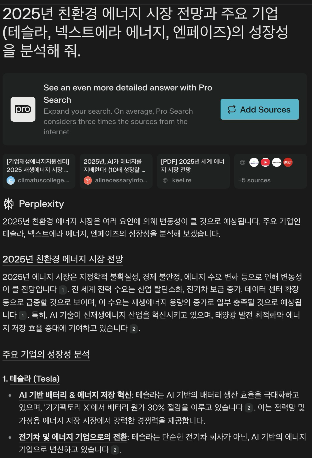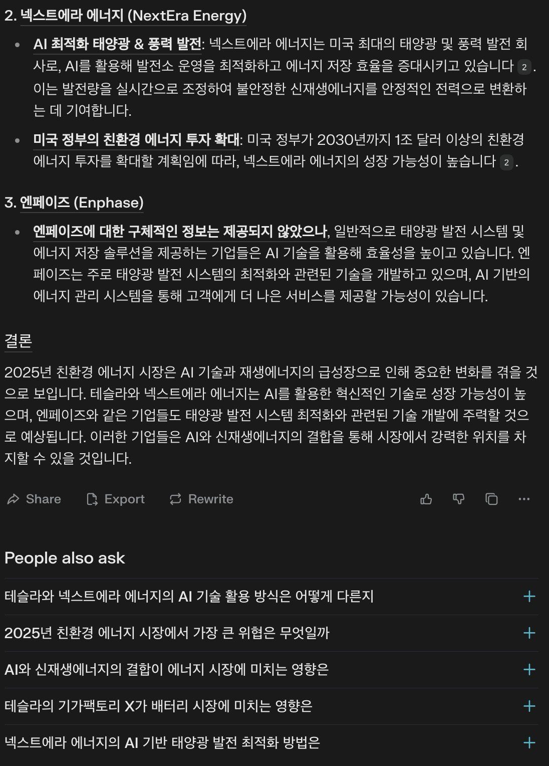 💬 "2024년 친환경 에너지 시장 전망과 주요 기업(테슬라, 넥스트에라 에너지, 엔페이즈)의 성장성을 분석해 줘."