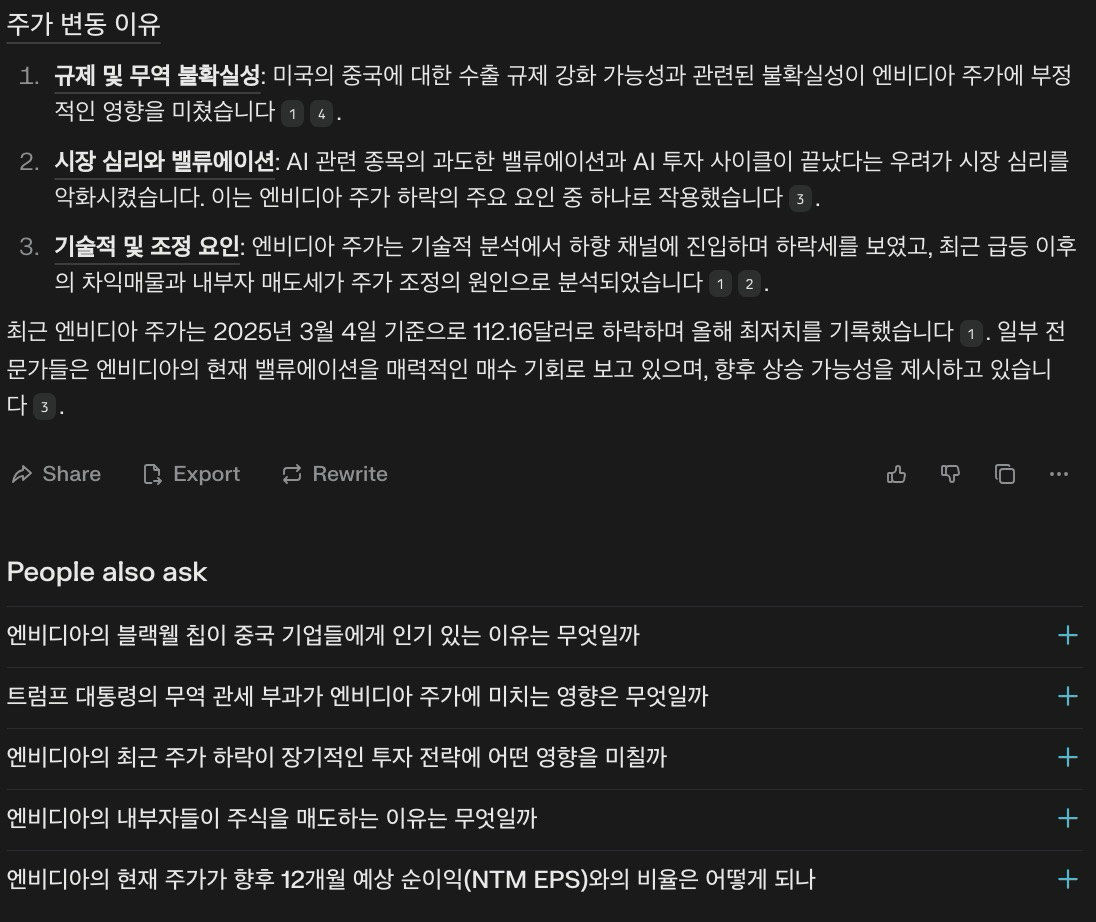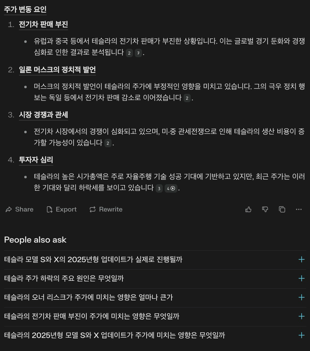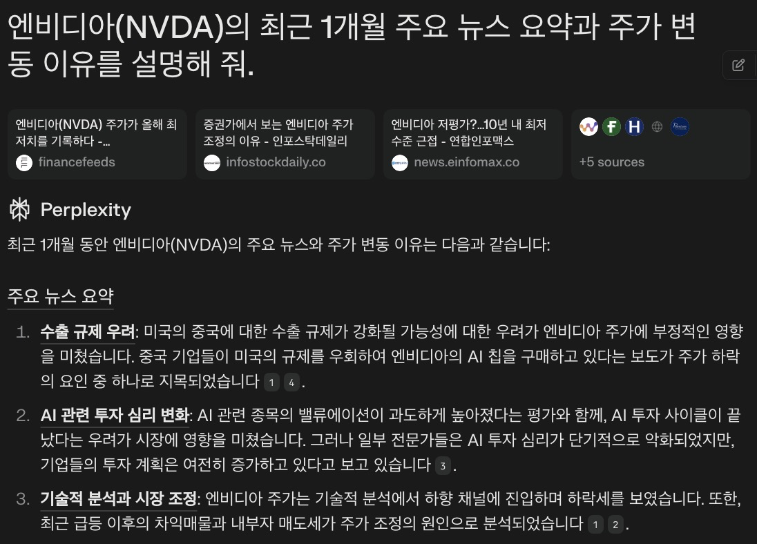 Perplexity AI를 활용하면 특정 기업의 최신 뉴스와 주요 주가 변동 요인을 빠르게 파악할 수 있습니다.