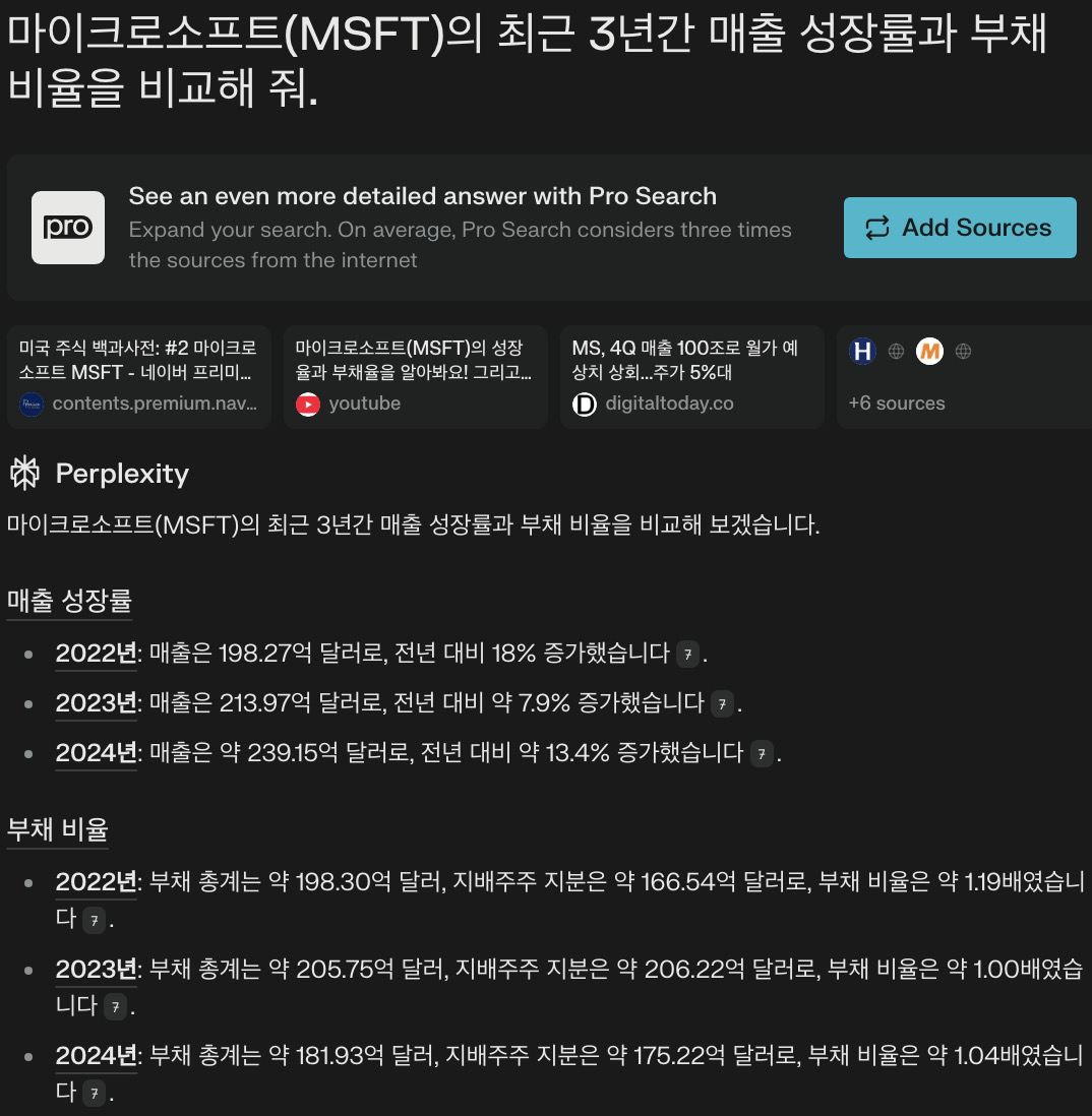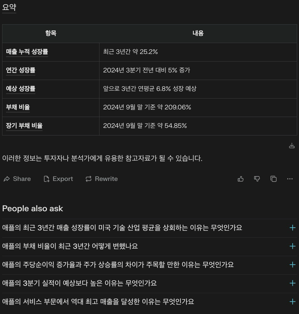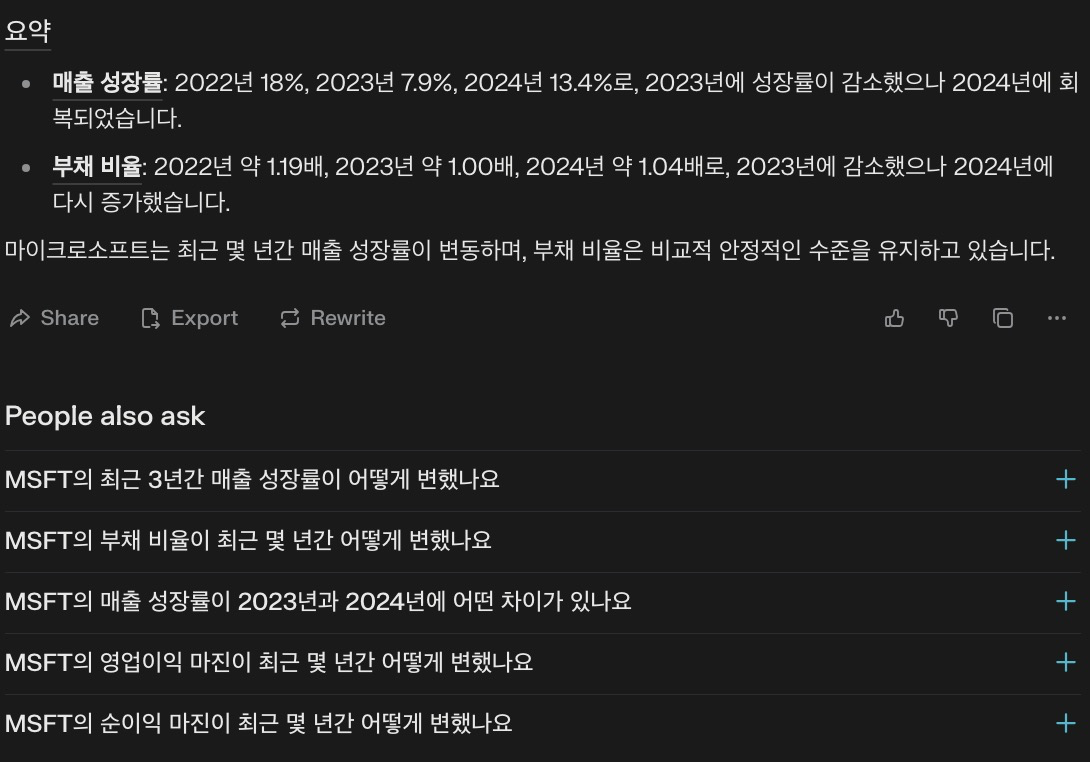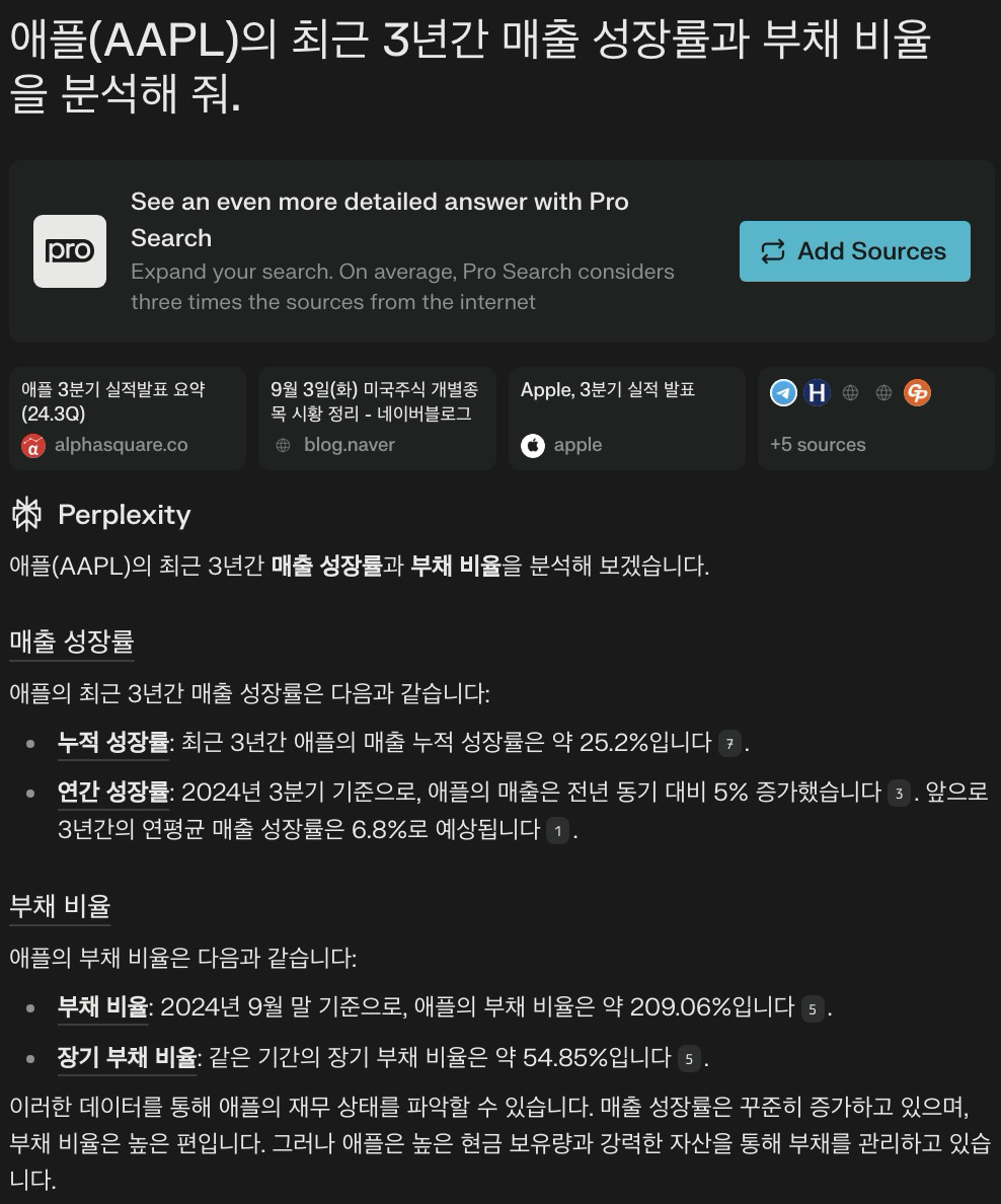 Perplexity AI를 활용하면 기업의 매출 성장률, 부채 비율, 순이익률 등을 빠르게 확인할 수 있습니다.