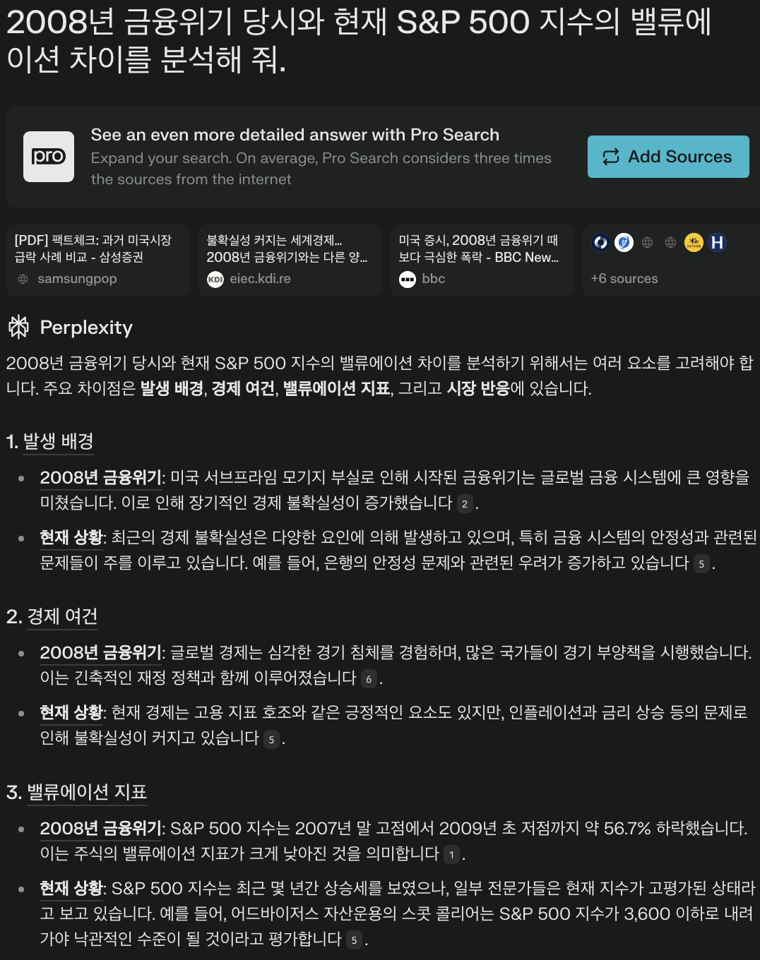 💬 "2008년 금융위기 당시와 현재 S&P 500 지수의 밸류에이션 차이를 분석해 줘."