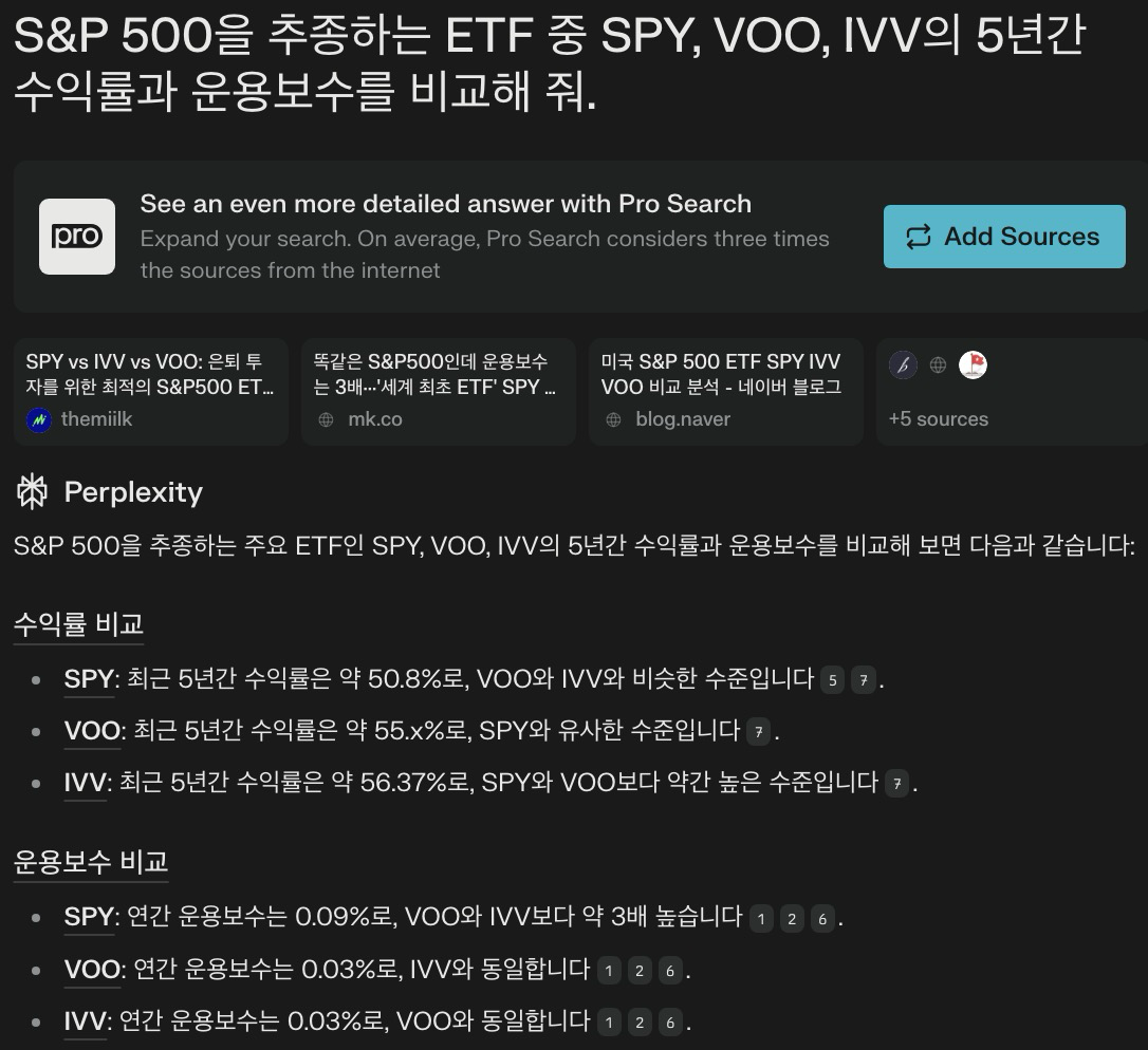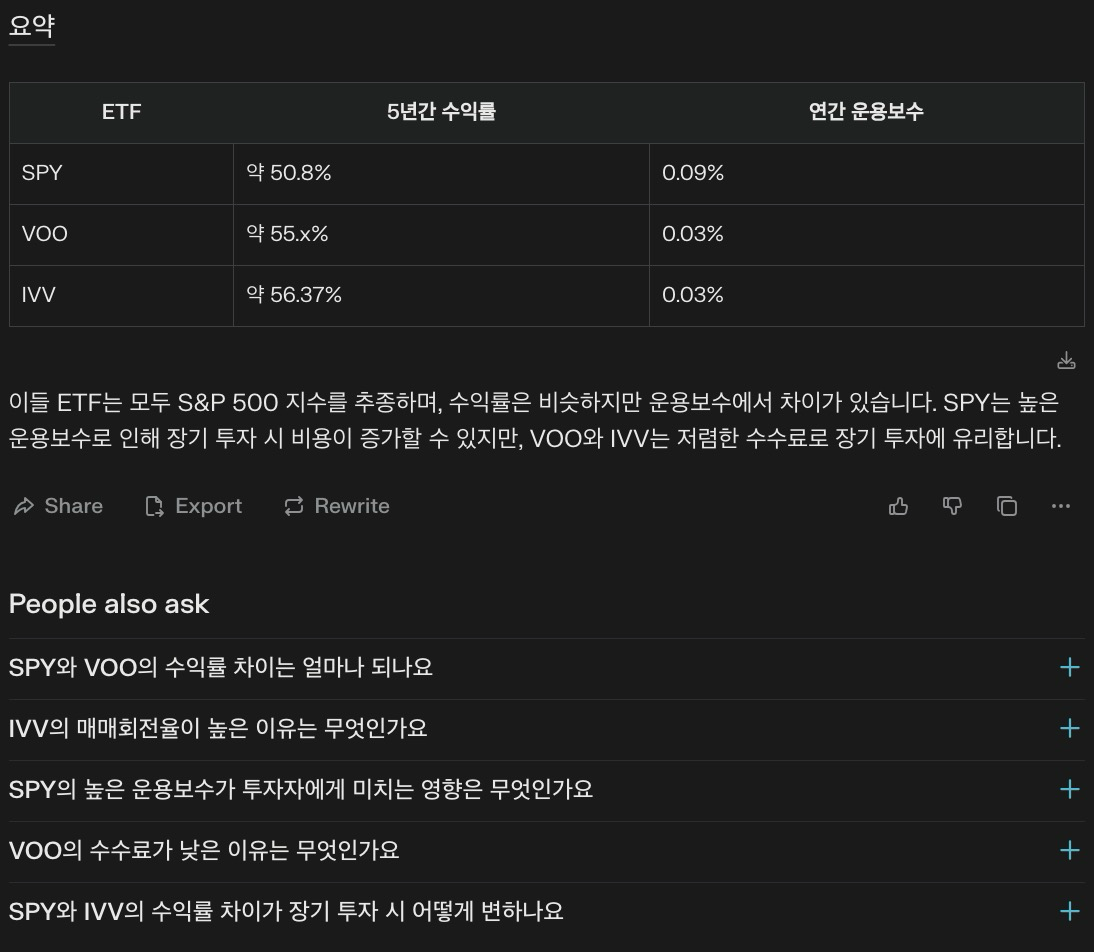 Perplexity AI를 활용하면 특정 ETF의 과거 성과, 수수료 구조, 보유 자산 등을 빠르게 비교할 수 있습니다.