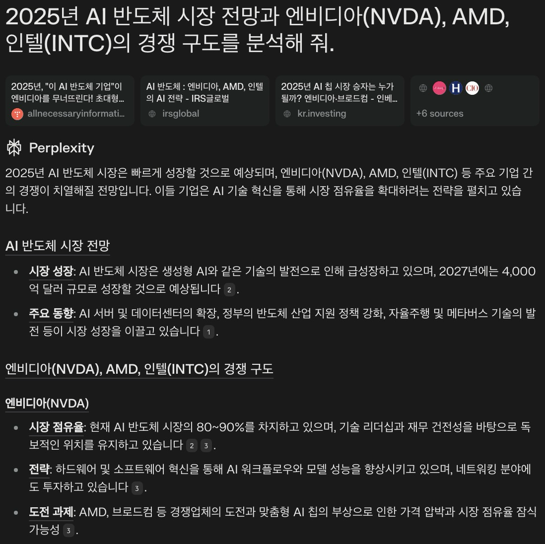 💬 "2025년 AI 반도체 시장 전망과 엔비디아(NVDA), AMD, 인텔(INTC)의 경쟁 구도를 분석해 줘."