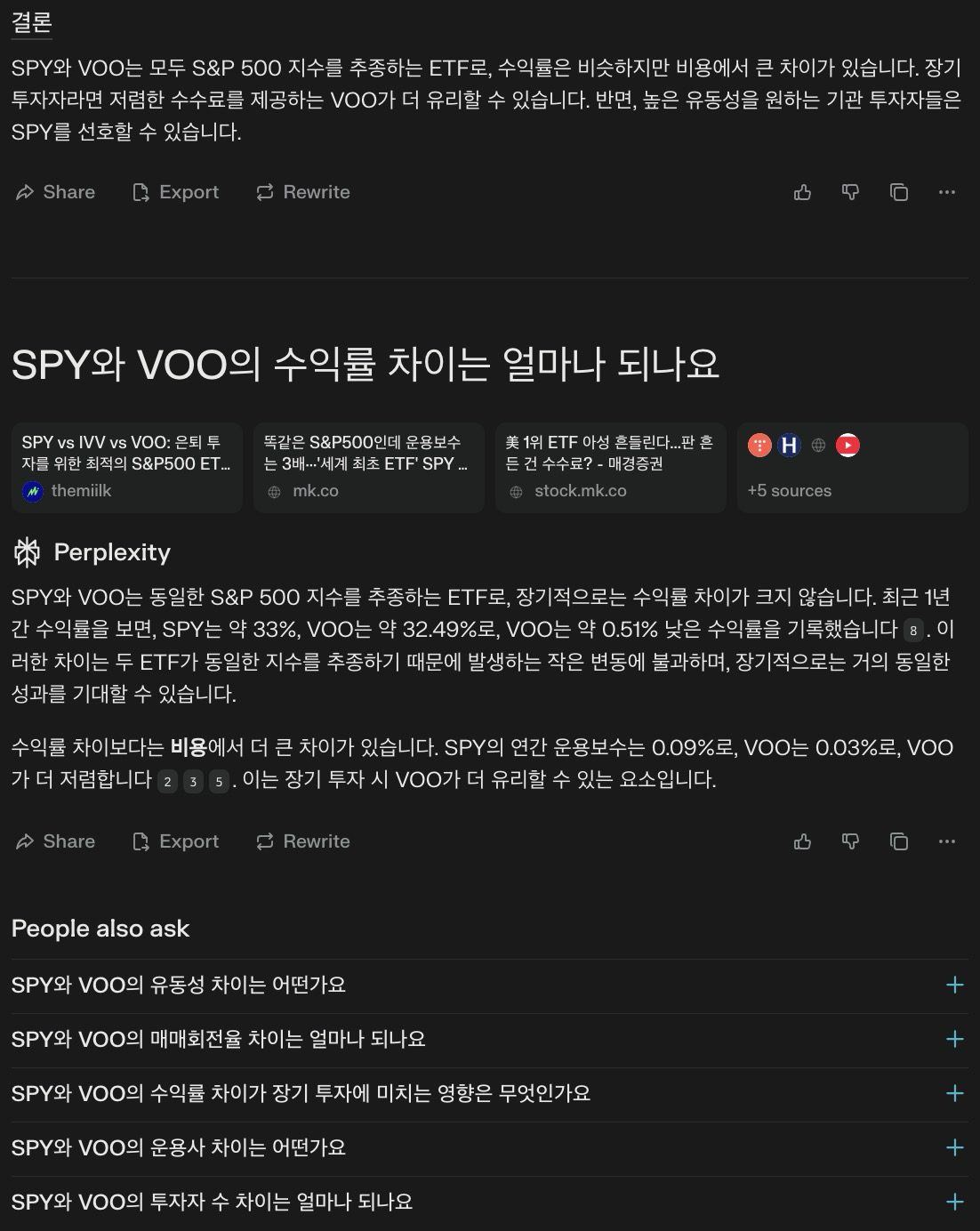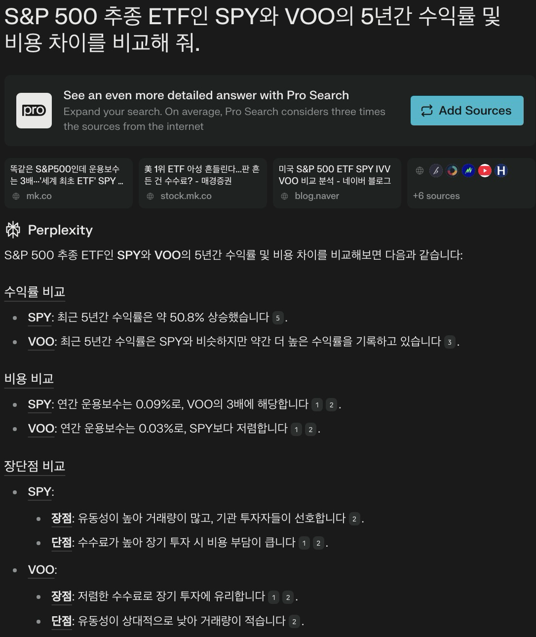 💬 “S&P 500 추종 ETF인 SPY와 VOO의 5년간 수익률 및 비용 차이를 비교해 줘.”