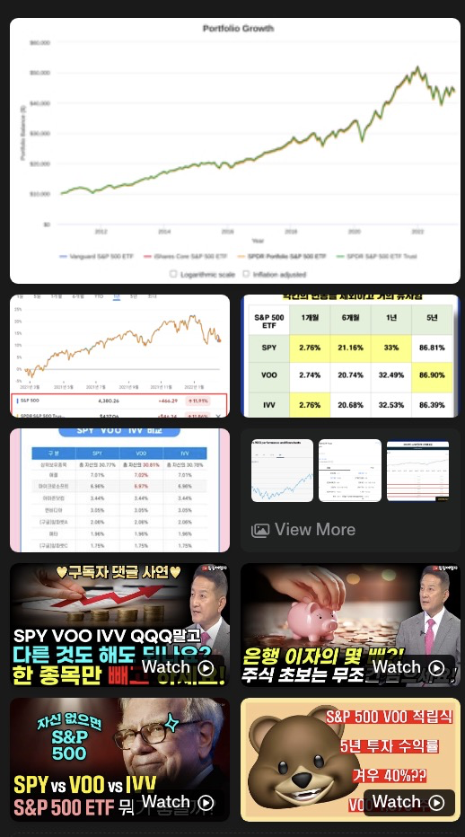💬 "S&P 500을 추종하는 ETF 중 SPY, VOO, IVV의 5년간 수익률과 운용보수를 비교해 줘."